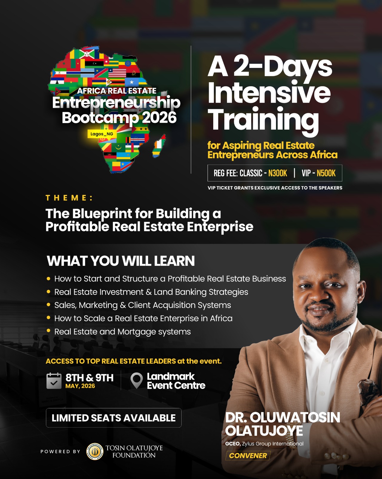 A transformational 2-day bootcamp equipping you with the knowledge, strategies, and network to succeed in Africa's booming property market. Powered by the Tosin Olatujoye Foundation.